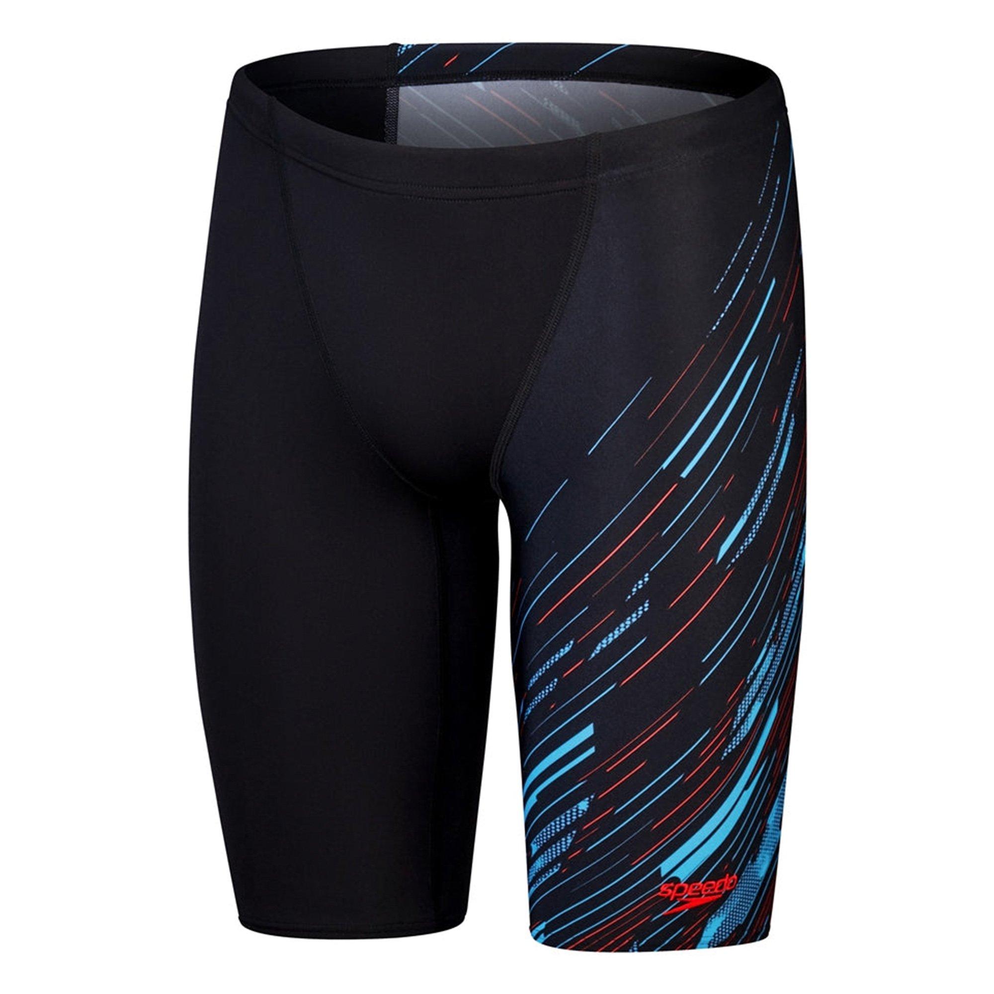 Make a statement in Hyper Boom logo prints. Celebrating the Speedo brand, this sleek black V-Cut Jammer showcases an evolutionary Hyper Boom graphic in striking shades of blue and red. Featuring integral support and engineered V-cut panels for enhanced comfort and security, the jammer includes a drawstring waist for a tailored fit. Made from our durable Endurance+ fabric, which is quick-drying and chlorine-resistant. Plus, the polyester yarn in the Endurance+ fabric is made from 100% post-consumer waste, such as recycled plastic bottles.