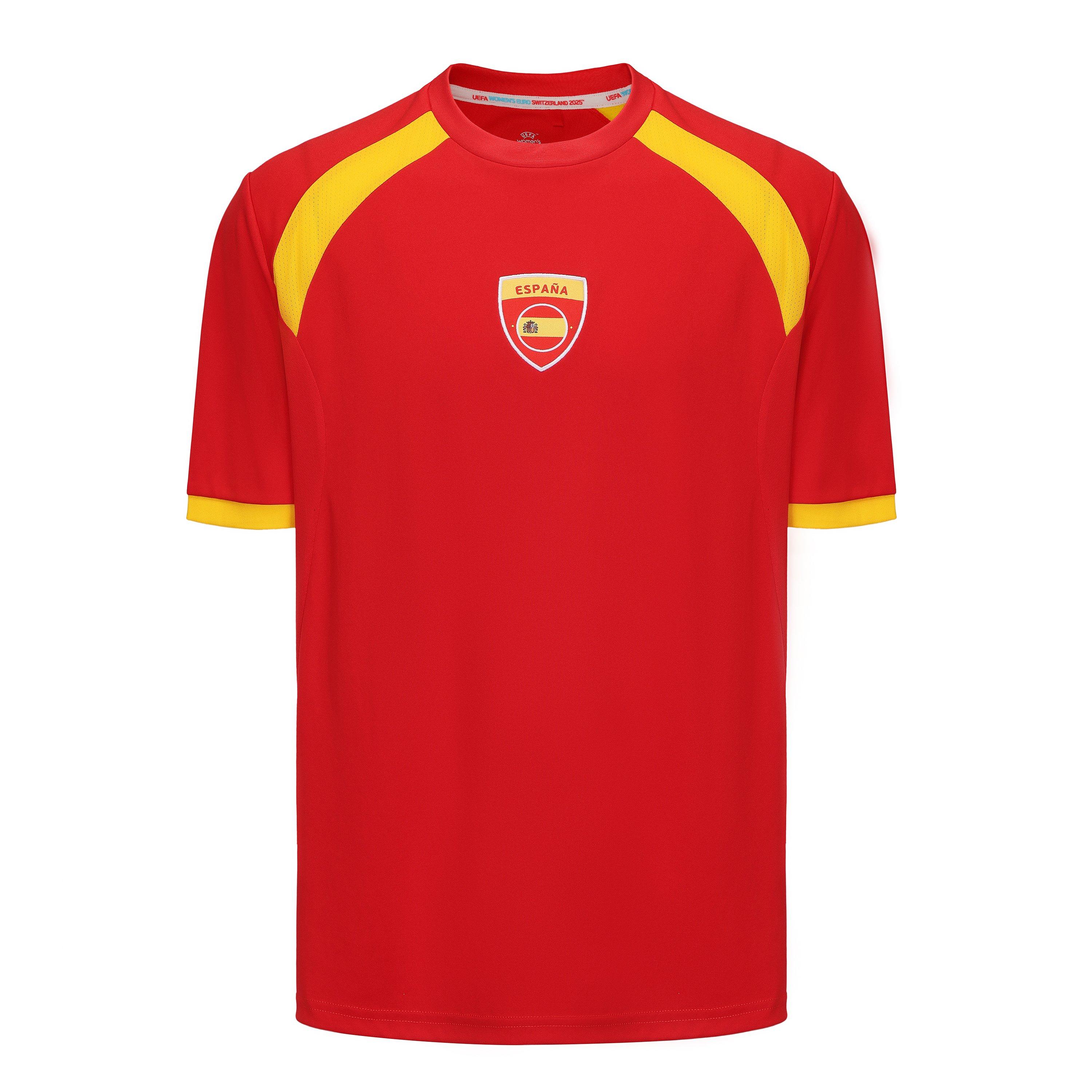 Support La Roja in style with the UEFA Euros 2025™ Spain T-Shirt for adults. Featuring the team's iconic colourway, it’s made from breathable fabric for comfort and easy movement all day long. Finished with the Spain flag badge on the chest for a bold, national statement. Ideal for matchdays, watch parties, or repping your team wherever you go.
